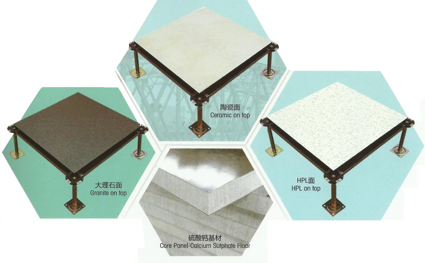 采用优质硫酸钙基材,表面可附HPL,陶瓷(玻化石)大理石和花岗岩贴面,四边粘导静电胶条,底面采用压花铝箔或者镀锌钢板。横梁选用钢材压模成型,支座丝杆可任意调节高度。